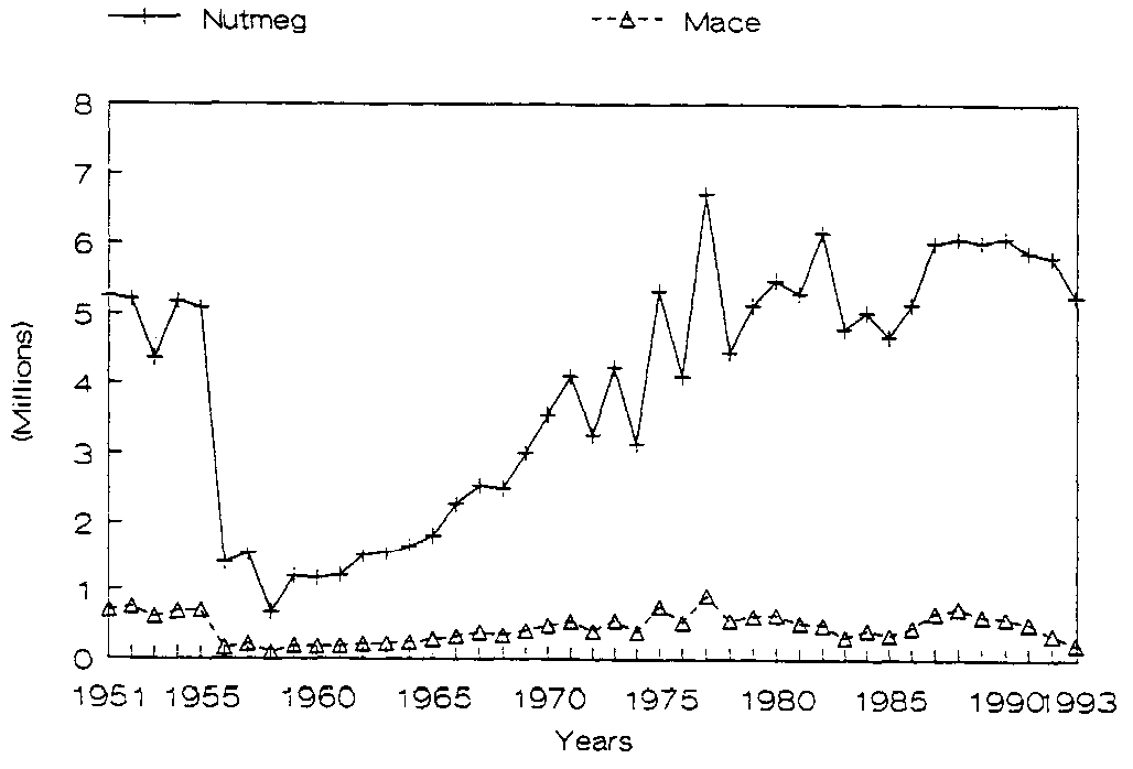 Tables 3 and 4 and fig. 5 and 6 compare the production figures and export in pounds for nutmeg and mace for the period 1951 -1993.
