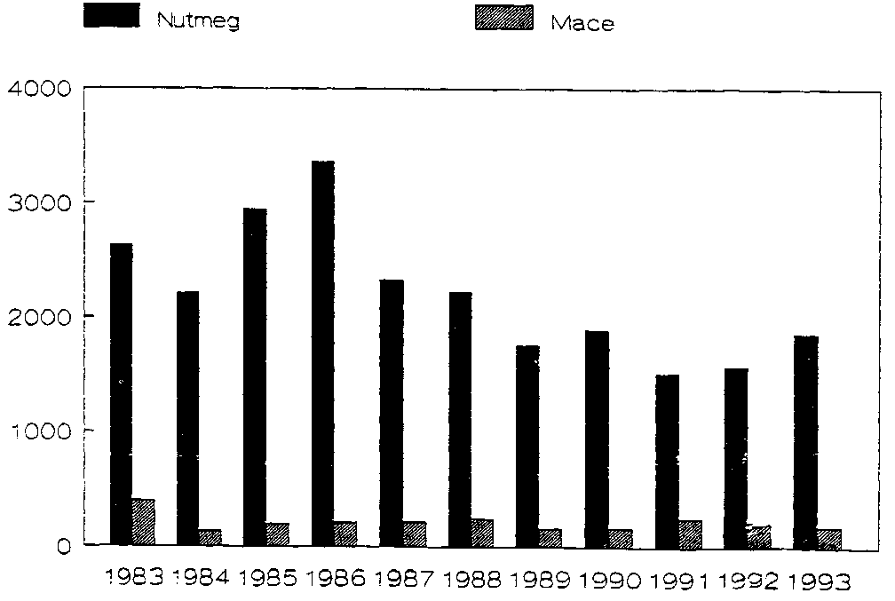 Fig. 7 Quantities of Nutmeg and Mace Exported (in tons) 1983 - 1993