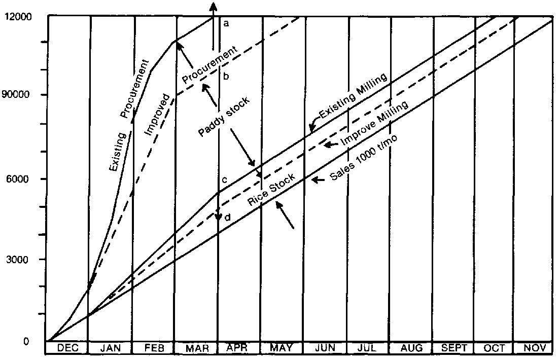 As shown in the diagram, there are two points at which the storage operation is taking place - after procurement (or drying) and just before distribution. Procurement is dictated by production in terms of timing quantity and quality. It is generally predictable and therefore the paddy storage operation can be programmed.