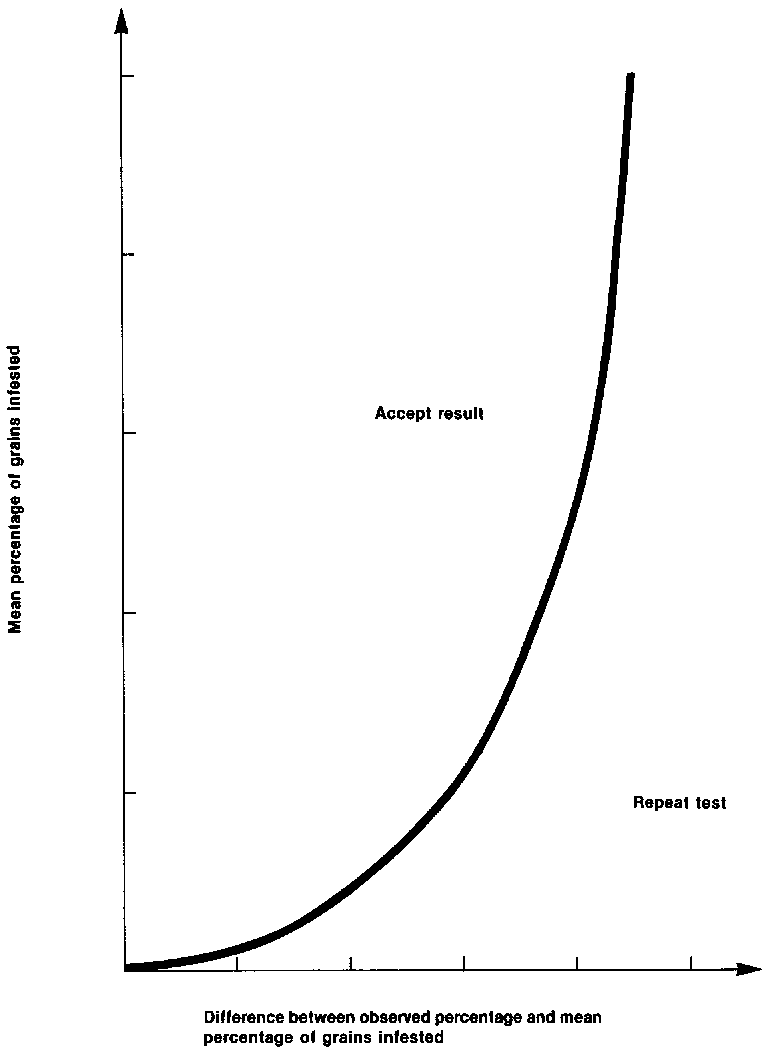 The difference between the result of either determination and the mean shall not exceed the limit indicated in figure 5. If this limit of repeatability is exceeded, repeat the determination on other test portions until the requirement is satisfied.