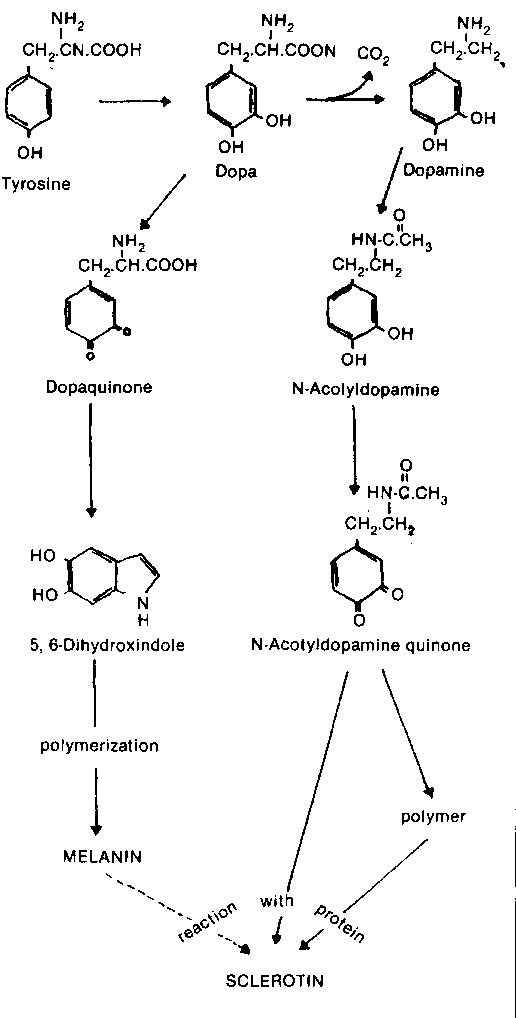 The quinones are derived from the amino acid tyrosine which accumulate in the haemolymph before ecdysis, and migrate into the cuticle during the hardening process. The intermediary in this reaction is the diphenol N-acetyldopamine, which is derived from tyrosine. In the presence of the oxidative enzyme phenolase, the quinone is 'ultimately formed which tend to condense with one another and fill the spaces between protein chains or form the polymerized indole pigment melanin. The cross-linked, pigmented protein of the exocuticle or sclerotin, produced by the action Of quinones, is responsible for the common brown or black colouration of the insect integument. Many other integumentary colours are formed from interference by the interaction of light through thin films separated by a material of different refractive index or fine striations on the cuticular surface, and by the accumulation of other pigments in the blood or epidermal cells below a fairly transparent cuticle.