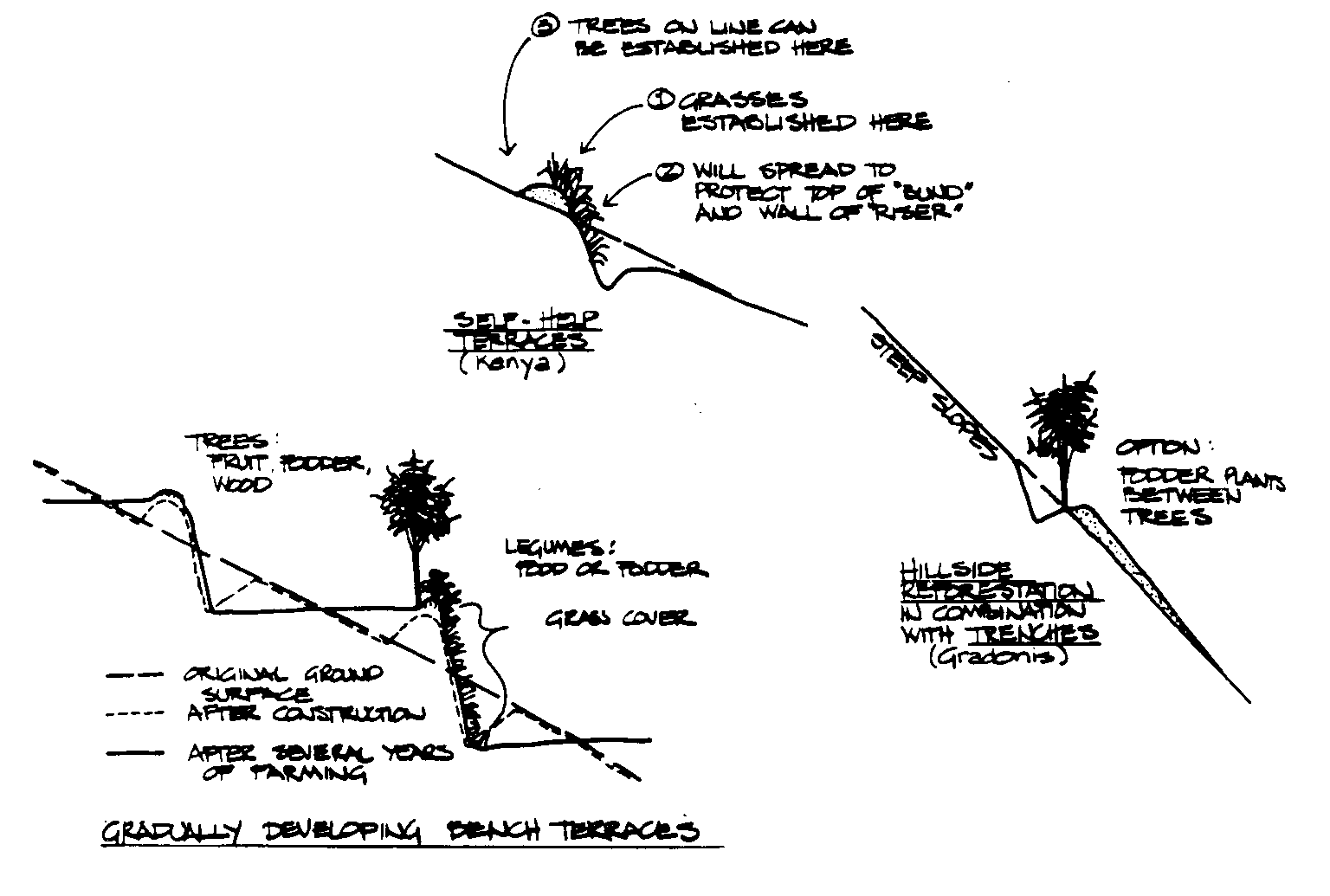 y shrubs. Algunos también involucran también métodos de conservación de tierra físicos, como los espinazos del contorno,