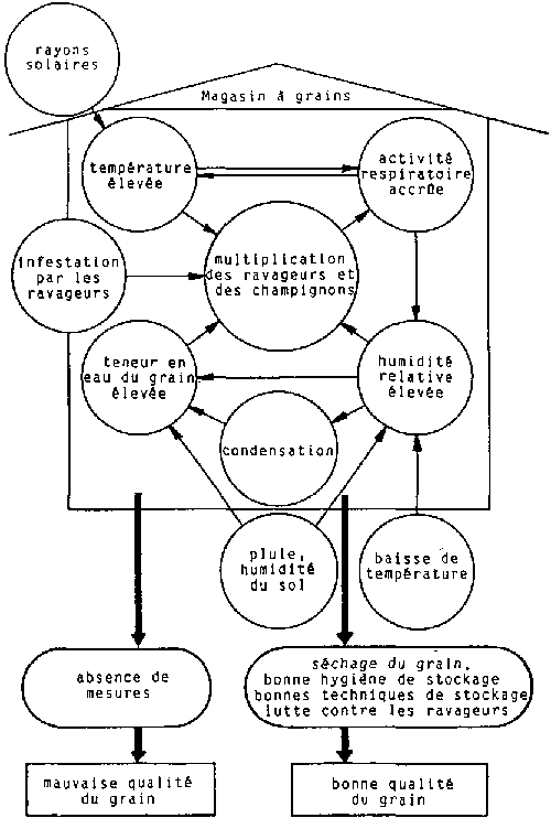 Températures élevées humidité relative élevée et taux d'humidité élevée de la marchandise stockée favorisent le développement des organismes pathogènes. La respiration des agents pathogènes produit de l'humidité et de la chaleur ce qui améliore encore ces conditions de développement et entraîne par là même un accroissement des populations de ravageurs.