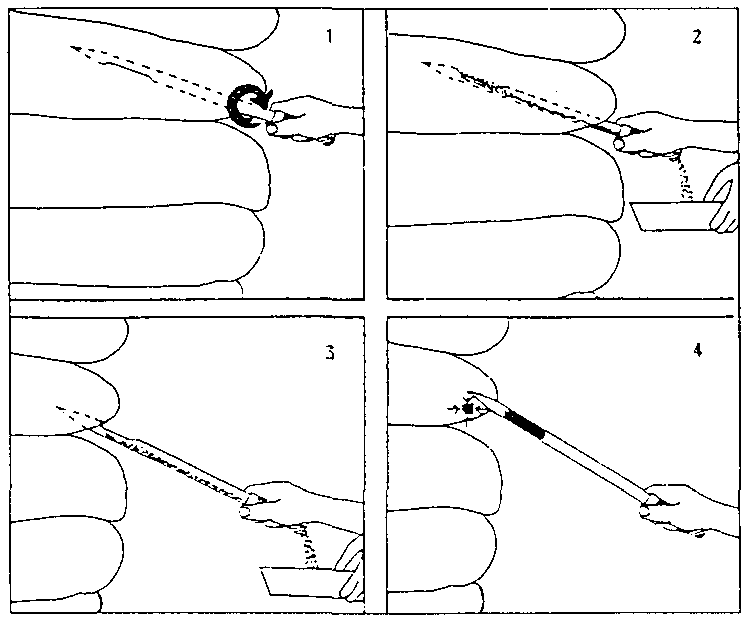 Enfoncez la sonde à échantillons en diagonale et de bas en haut dans le sac (1), en la faisant ensuite tourner de manière à ce que la marchandise tombe dans l'ouverture et s'écoule à travers le tube creux et la poignée dans un récipient (2). Retirez- la du sac pendant la prise d'échantillon (3) et fermez le trou dans le sac avec la pointe de la sonde (4).