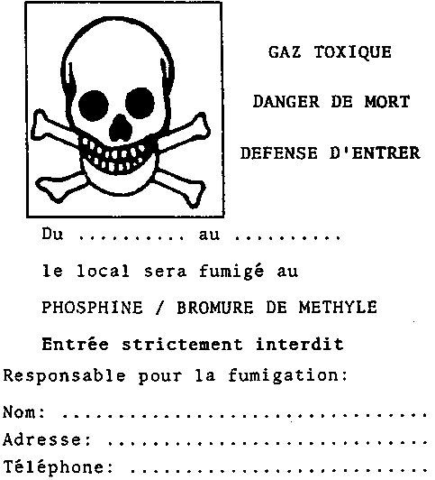 Après avoir appliqué le fumigène, fermez l'entrepôt à clé et apposez une pancarte d'avertissement (cf. section page suivante) sur chacune des portes. Indiquez sur ces pancartes le type de fumigène employé, la date du traitement, le nom du responsable de fumigation et l'endroit où on peut le joindre.