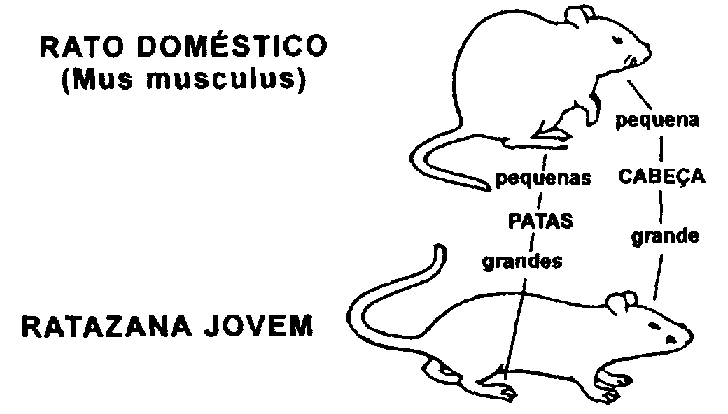 | Mus musculus | Cor variável. Orelhas grandes; olhos pequenos; focinho bicudo. 5 pares de tetas. |