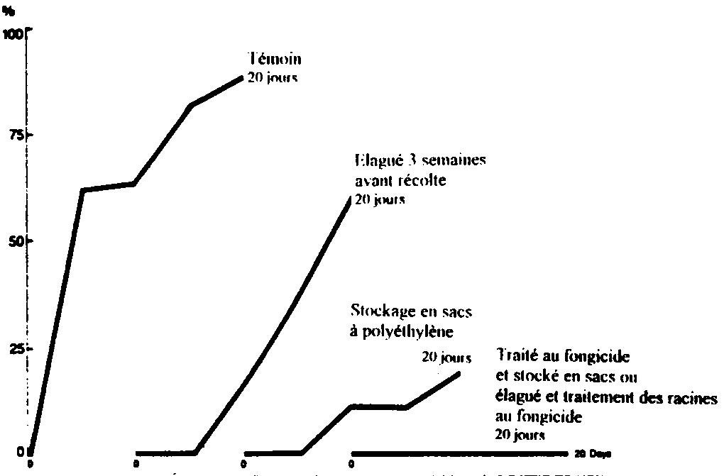 Ce type de stockage permet par ailleurs d'adapter le rythme des récoltes à la consommation. Après dépassement de la période optimale de récolte, la racine perd de sa substance, et notamment de l'amidon, sa composante essentielle du point de vue alimentaire, au fur et à mesure que le stockage se prolonge (cf. figure 14). Elle commence dans le même temps à se lignifier, tandis que l'on observe des altérations de la saveur (LANCASTER et COURSEY, 1984).