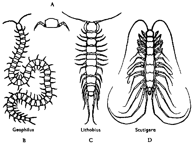 A - Une seule paire de pattes sur chaque segment. Corps à section quadratique. Animaux agiles porteurs de 15 à 173 paires de pattes. Des espèces tropicales peuvent atteindre une grande longueur (jusqu'à 26,5 cm) (fig.3) ........... Centipèdes (Chilopoda)