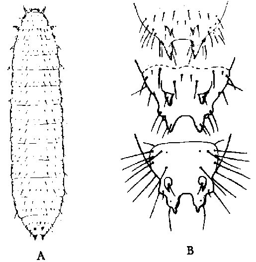 - Les segments du corps portent chacun sur les côtés de leur face ventrale 2 soies; leur face dorsale est peu sclérotinisés et les segments abdominaux à peine bicolores. Epine terminale généralement plus courte que les quelques épines environnantes (fig. 83 au dessus de A, D). Larves jusqu'à 12 mm de long............................................. Petit ténébrion mat, Alphitobius laevigatus (FABRICIUS, 1781)