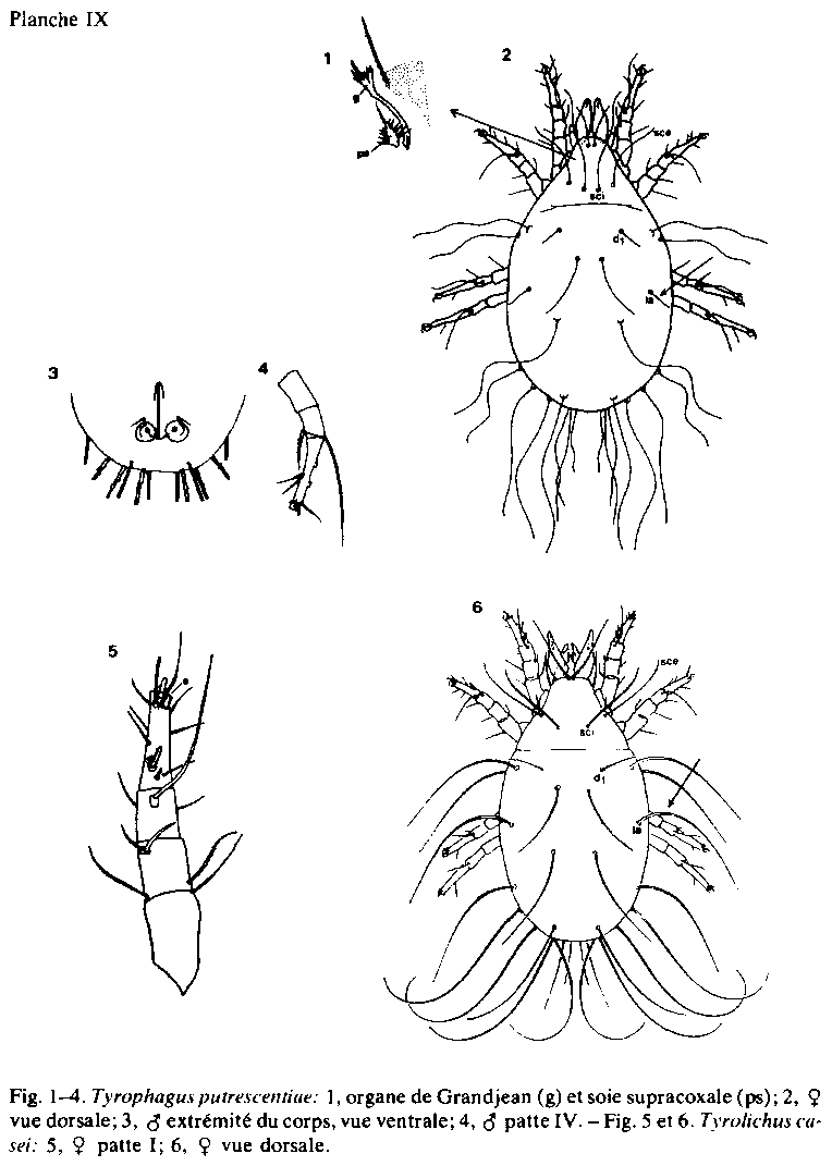 - Article terminal des pattes sans écaille velue. En avant, sur le milieu du dos, une crista metopica (Pl. XVII, fig.5). Corps arrondi, blanchâtre, long de 0,3-0,75 mm..............Glycyphagus domesticus (DE GEER, 1778)