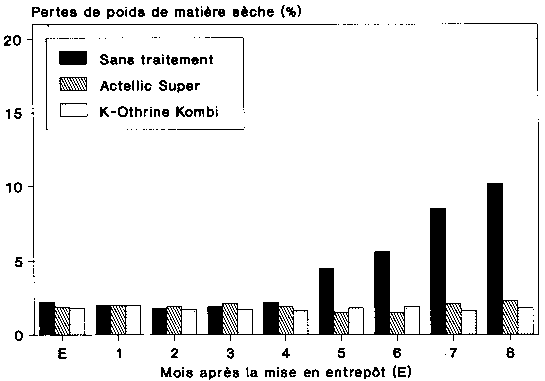 - stockage en sacs; traitement au K-Othrine Kombi (pirimiphosméthyl (1,0%), deltaméthrine (0,1%), en poudre).