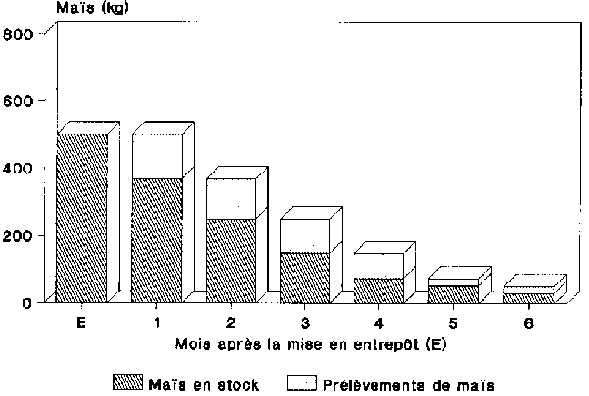 Les résultats des essais ont montré qu'il y avait eu des prélèvements de maïs continuels dans l'entrepôt (figures 5.7 et 5.8). A l'issue d'une période de stockage de trois mois, plus de la moitié de la quantité emmagasinée avait déjà été prélevée. Environ 5 % seulement de la quantité emmagasinée sont demeurés plus de 6 mois dans l'entrepôt.
