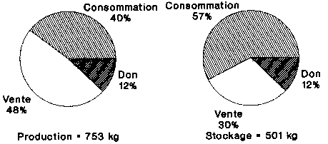 Par la méthode de détermination des quantités de production orientée sur les besoins, on arrive à un besoin semestriel en mais de 306 kg pour la couverture des dépenses irrégulières. Ces dépenses sont en général effectuées directement après la récolte, avant l'emmagasinage du maïs Pour pouvoir faire face aux deux tiers de ces dépenses, le chef d'exploitation doit, pour un prix moyen du maïs de 75 FCFA/kg, vendre un quart de la production. Au cours des deux périodes d'enquête, 75 % en moyenne de la quantité de production ont été mis en stocks. Ce taux est identique à celui établi à partir des besoins.