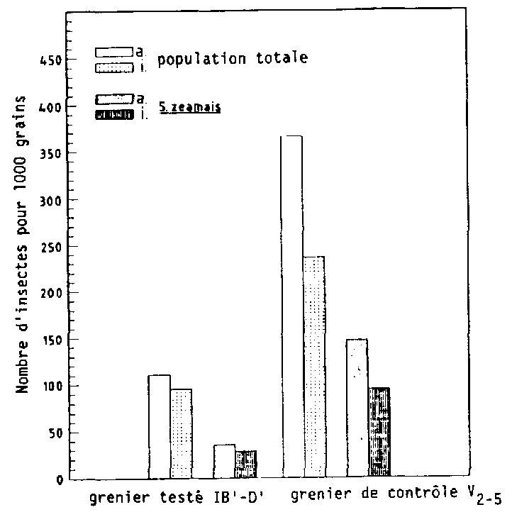 L'examen des résultats du test "t" a montré qu'il n'était pas possible de mettre en évidence des différences d'infestation dans les greniers testés, et cela ni d'un point de vue sectoriel, ni au niveau de différences éventuelles entre les couches extérieures et les couches centrales des greniers L'intensité moyenne d'infestation relevée au sein des couches extérieures était de 110,4 insectes pour 1000 grains. Le nombre d'insectes nuisibles recensé au centre, 95,0 insectes pour 1000 grains, n'était que très légèrement inférieur. L'examen du nombre de S. zeamais n'a pas fourni de résultat contraire,