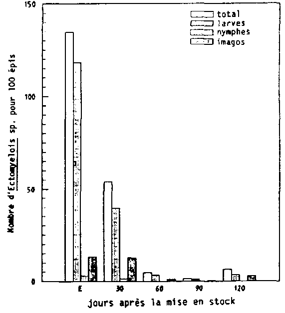 On a observé au cours des deux premiers mois de la grande saison de stockage une progression de 74 % du nombre des teignes, ce nombre passant de 31,9 à 54,5 teignes pour 100 épis. Plus de 80 % de l'ensemble des formes se trouvaient encore au moment de cette phase au stade larvaire. Après le point maximum d'infestation, intervenu au 60ème jour après la ME l'intensité de l'infestation a décru de manière continuelle jusqu'au 180ème jour après la ME, pour descendre à cette date à 9,0 Ectomyelois sp. pour 100 épis. Au fur et à mesure du recul de l'infestation, le nombre des larves a diminué au profit de celui des imagos.