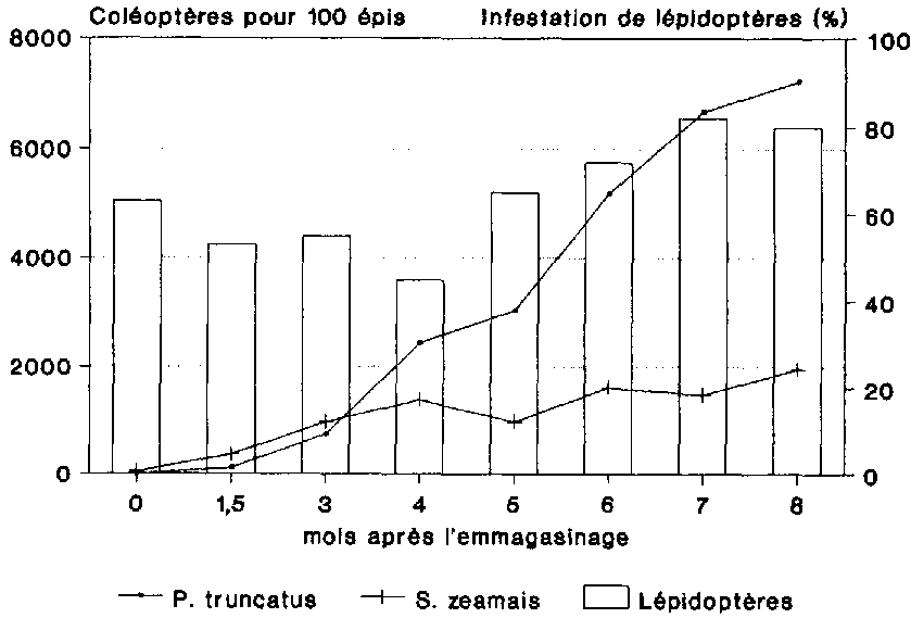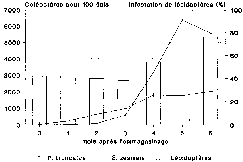 A Davié, l'infestation par P. truncatus n'a manifestement débuté que beaucoup plus tard. Les premiers coléoptères ont été découverts au bout de quatre mois seulement, le ravageur étant d'autant moins abondant à la fin de la période d'observation. Il faut cependant noter que la population a fortement évolué en deux mois, puisque l'on a trouvé au sixième mois de stockage 1 008 coléoptères pour 100 épis.
