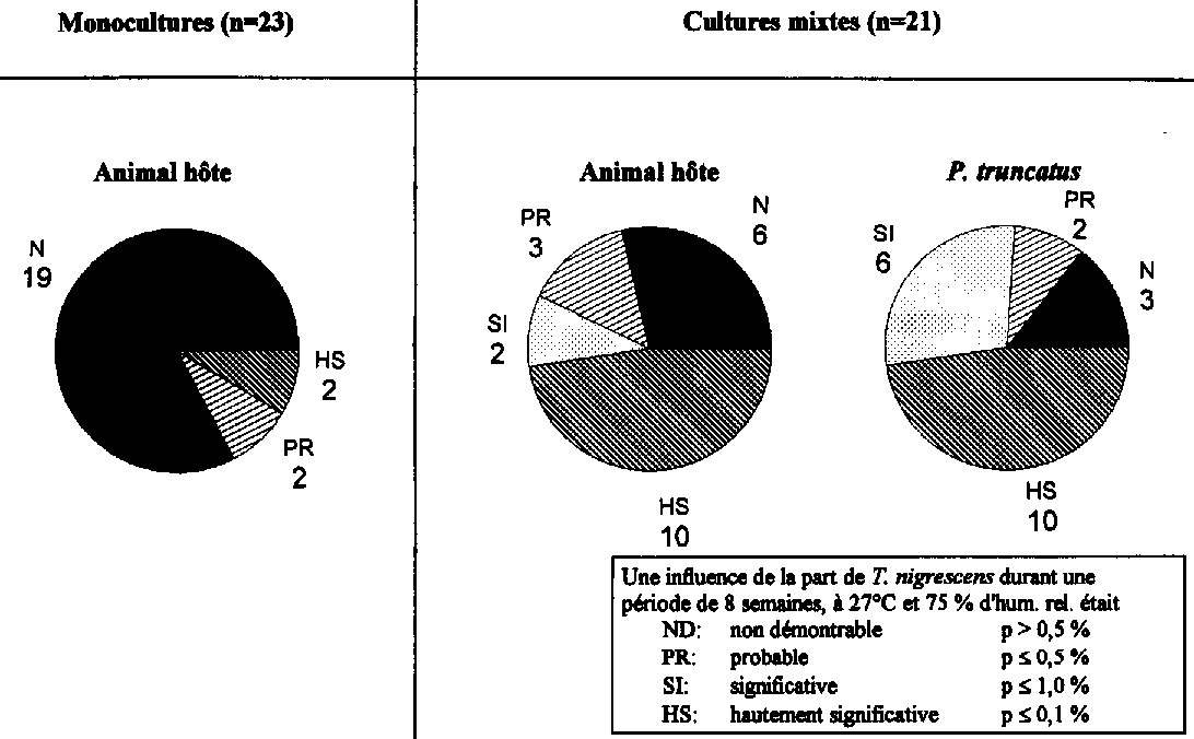 On serait tenté de croire que pour pouvoir exercer une influence inhibitrice significative sur la population d'animaux hôtes, il faudrait impérativement que de nombreux individus de la génération F1 du prédateur se développent dans les préparations. Selon REES (1985), une larve de T. nigrescens détruit à peu près 60 larves de P. truncatus pour assurer son évolution jusqu'au stade de l'imago. Les quelques exemples qui suivent prouvent cependant que cette seule explication est insuffisante.
