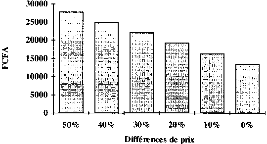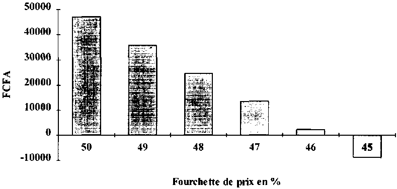 Le prix d'achat moyen du paddy (novembre) au cours de la période 1986-1988 s'établissait à 98,89 FCFA/kg. La fourchette entre le prix d'achat et le prix de vente après traitement (vente en juillet) était en moyenne de 137 % au cours de la même période. Même en tenant compte des investissements plus élevés requis par la machine à décortiquer, les risques liés au stockage du riz sont nettement inférieurs à ce qu'ils sont dans le cas du sorgho.