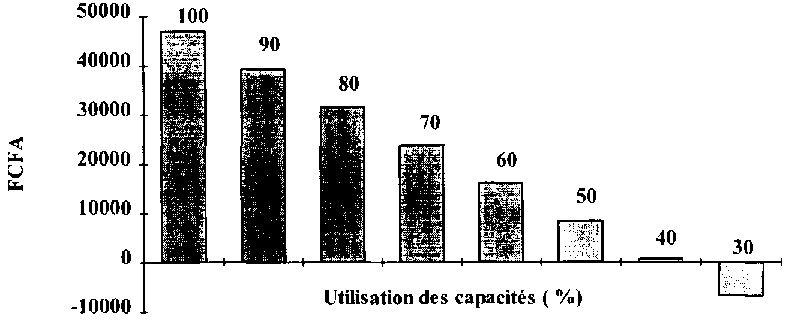 Fig. 25: Budget annuel des recettes et dépenses pour le type 3.3, pour des frais de construction évalués à 600 000 FCFA, une utilisation des capacités à 100 % et diverses fourchettes de prix (différence en % entre les prix d'achat et de vente)