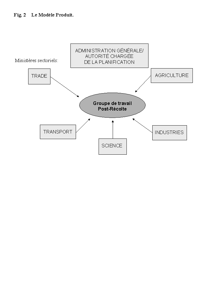 Dans le modèle produit (voir fig. 2), le groupe de travail est une unité de soutien relativement indépendante. La mission est partagée par les ministères et organismes de tutelle. Les ministères détache du personnel et fournissent d'autres moyens au groupe de travail. Le travail a pour but d'optimiser toute la chaîne des opérations post-récolte pour un produit agricole donné (axé sur le produit) dans un pays ou une région. Il n'y a, pour ainsi dire, pas de priorités définies pour certains acteurs ou certaines zones (producteur/consommateur ou zone urbaine/rurale). L'analyse des systèmes post-récolte spécifiques aux produits constitue une activité importante. Les interventions qui en découlent pourraient alors être exécutées par un ministère / une organisation compétent(e).