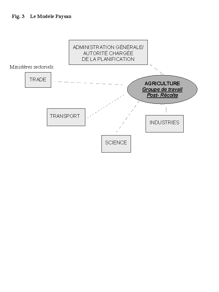 Le modèle paysan présente l'avantage d'être relativement facile à mettre en place, puisque les discussions concernant la mission, les objectifs et l'organisation du groupe de travail ne se déroulent que dans un seul ministère. Nombreux sont les cas où le savoir-faire nécessaire dans les disciplines est disponible (voir tab. 2). Le ministère peut mettre en place différents groupes de travail pour des sujets hiérarchisés. Dans l'exemple donné à la figure 3, le ministère de l'Agriculture a mis en place des groupes de travail sur l'élaboration de stratégies agricoles, sur la fertilité des sols, sur les systèmes post-récolte et sur la fourniture d'intrants et de crédits. Ces groupes sont installés pour un certain temps (mois ou années) jusqu'à ce que les objectifs soient atteints et/ou d'autres thèmes soient jugés plus prioritaires. Cette organisation offre une réponse extrêmement souple aux problèmes et exigences qui risquent de surgir. Dans le cas du Groupe de travail Post-Récolte, les experts de thèmes comme les cultures, l'élevage, le génie rural, les statistiques et la vulgarisation constitueraient des "chefs d'activité" pour différentes interventions. L'inconvénient du modèle paysan réside dans le fait que la concertation avec les autres ministères restent limitée et ponctuelle, de même que la prise en compte des autres acteurs et parties prenantes qui ne sont pas basés au village.