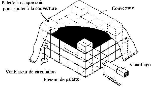 Si la pluie ou des champs inondés empêchent le séchage en plein champ et qu'il n'y a pas d'installation couverte pour le séchage, on peut se servir d'une tente improvisée pour sécher les oignons. Dans l'illustration ci-dessous, on s'est servi de grandes bâches pour construire une tente. On force de l'air chaud à entrer dans un creux (appelé un "plenum") au milieu des bacs d'oignons. On utilise plusieurs ventilateurs pour faire circuler l'air chaud à travers les oignons pendant le procédé de séchage.