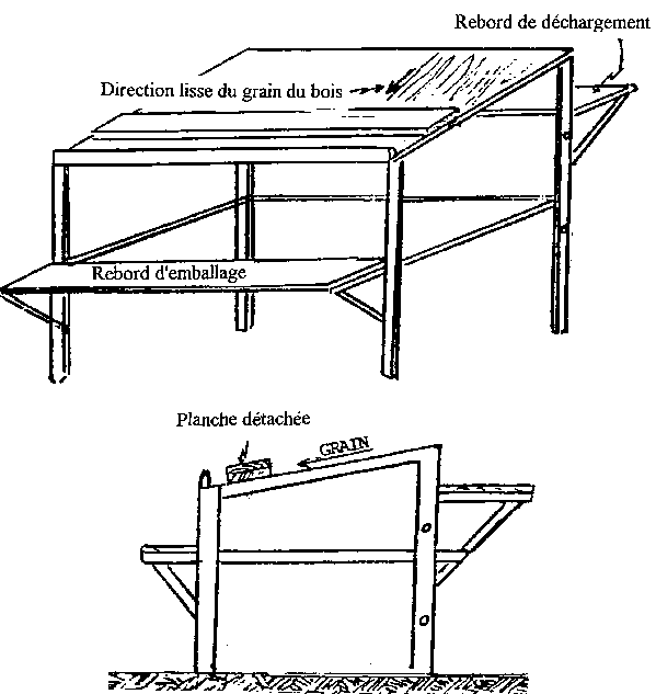 La station de conditionnement illustrée par le schéma ci-dessous pourra être ratadiée à une autre station du même modèle si l'on a besoin de plus de place pour conditionner les fruits et légumes. Quand il est nécessaire de parer les produits, il faudrait ajouter une planche détachée, assez épaisse pour dépasser la hauteur du bord de devant. Ce bord devrait être lisse et arrondi.