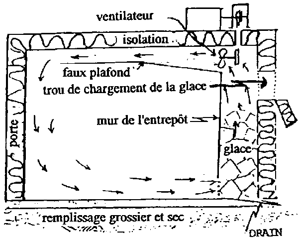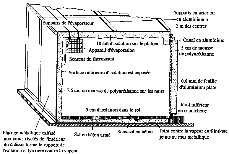 On peut construire des chambres froides peu coûteuses en employant du béton pour le sol et de la mousse de polyuréthanne comme isolation. Construire l'entrepôt en forme de cube réduira la surface par unité de volume d'espace de stockage réduisant de ce fait les coûts de construction et de réfrigération. Il faut calfater tous les joints et munir la porte d'un joint en caoutchouc.