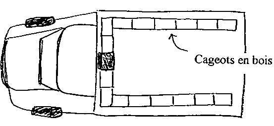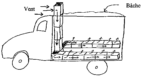 Ce système de ventilation a été conçu pour transporter des chargements en vrac de fèves en Iran. Le dispositif d'admission d'air et les conduits sont fabriqués à partir de cageots en bois. On enlève les panneaux latéraux, puis les cageots sont attachés avec du fil de fer de la manière montrée ci-dessous. L'air circule vers le haut pendant le transport, évitant la surchauffe du produit. On utilise aussi ce système pour les camions pick-ups, et pour le transport des légumes verts et des haricots vert. Les meilleurs résultats son obtenus quand le transport est effectué tôt matin, avant le lever du soleil.