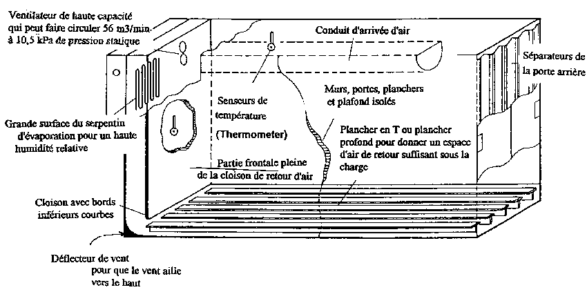 Pour une gestion optimale de la température de transport, les remorques réfrigérées doivent être isolées, avoir un dispositif de réfrigération de haute capacité et avoir un conduit d'arrivée d'air. L'illustration ci-dessous montre ceci et d'autres caractéristiques désirables pour une remorque avec arrivée d'air par le haut.