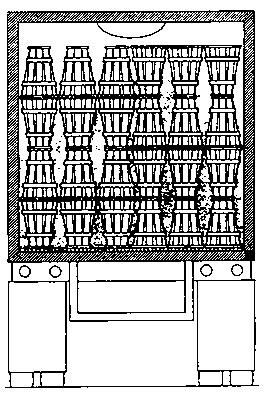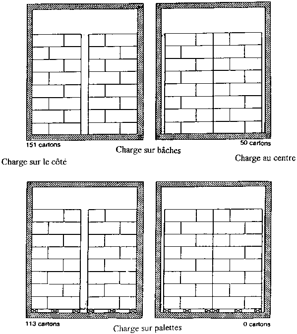 Seule la charge au fond à droite est tout à fait protégée du transfert de chaleur. L'emploi de palettes tient les cartons éloignés du plancher tandis que le chargement central laisse un espace d'isolation entre les palettes et les murs extérieurs.