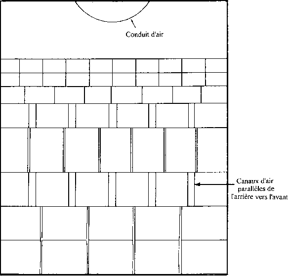 Les fruits et légumes transportés en cartons doivent aussi être empilés de manière à permettre une circulation d'air adéquate à travers la charge. Le diagramme ci-dessous illustre un chargement décalé de récipients partialement télescopiques. Sur le plancher du camion, les palettes ou d'autres supports doivent être employés pour éviter le contact direct des cartons avec le plancher.