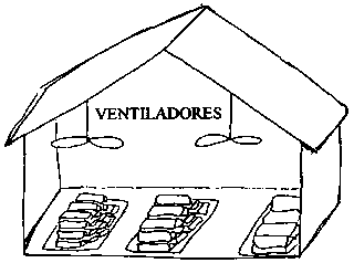 Si los calefactores se colocan cerca del techo, entonces serán necesarios unos ventiladores también en el techo para distribuir adecuadamente el calor hacia abajo, en dirección al producto. Los arcones (bins) de producto deben estibarse dejando un espacio de 10 a 15 cm (4 a 6 pulgadas) entre las filas, para una circulación adecuada del aire.