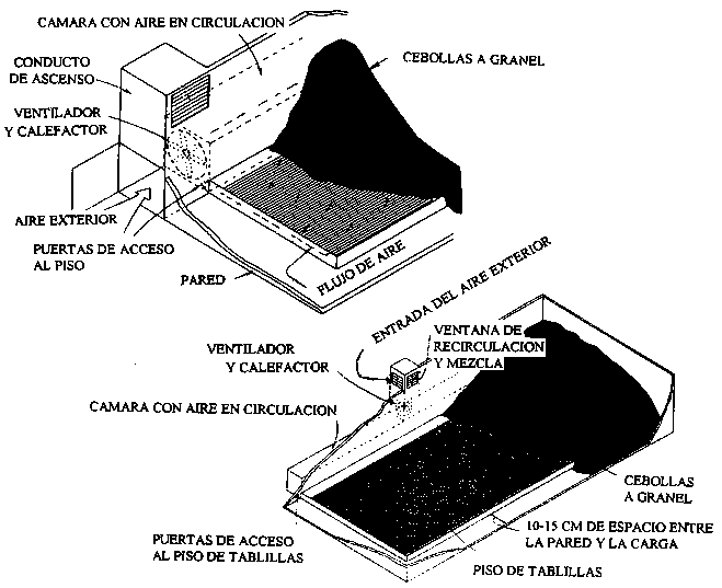El curado a granel requiere de un ventilador, una unidad calefactora y un falso piso de tablillas o listones. La siguientes ilustraciones muestran cómo el aire puede ser introducido, calentado y distribuido a través de la carga de cebollas en el cuarto de curado. Una abertura de descarga cerca del techo facilita la recirculación del aire calentado.