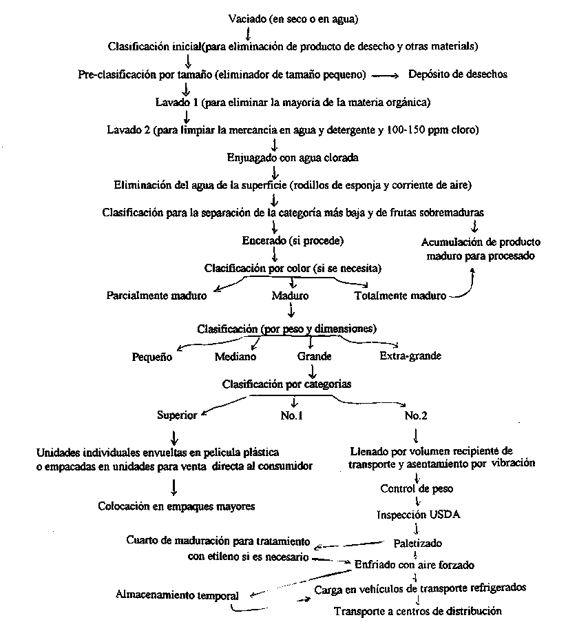 Una serie típica de operaciones en una empacadora se ilustra a continuación. El vaciado puede realizarse en seco o en agua, dependiendo del tipo de producto de que se trate. La limpieza, igualmente. puede llevarse a cabo con agua clorada o cepillado en seco. El encerado, si se practica, tiene que realizarse después del lavado y eliminación de la humedad superficial. La clasificación por tamaño, como se ilustra, divide el producto en categorías destinadas al mercado en fresco y al procesado. Una selección adicional separará el producto de menor tamaño para el mercado local o para ser procesado. Normalmente, los productos de mejor calidad son empacados y vendidos a nivel regional o nacional.