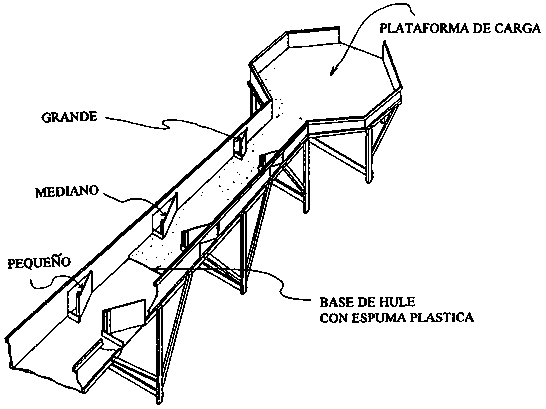 El cilindro rotatorio clasificador por tamaño mostrado abajo, se compone de cinco cilindros perforados que rotan en un movimiento contrario a las manecillas del reloj cuando se pone en marcha el motor eléctrico. Cada cilindro está perforado, con agujeros suficientemente grandes para permitir que las frutas caigan a través de ellos. El primer cilindro tiene los agujeros de diámetro más pequeño, y el quinto tiene los más grandes. Cuando las frutas pasan a través de ellos son recogidas por una bandeja inclinada, y ruedan hasta los recipientes, como se observa en la figura. Se debe tomar precaución de que la distancia de caída sea lo más pequeña posible para prevenir daños. Las frutas de mayor tamaño que los agujeros de los cilindros se acumulan al final de la línea. Este equipo funciona mejor con frutos de forma redondeada.