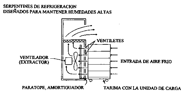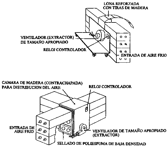 Las siguientes ilustraciones muestran dos tipos de enfriadores de aire forzado. Cada uno está equipado con un extractor que al succionar el aire frío en el almacén lo forza a pasar a través del producto empacado.