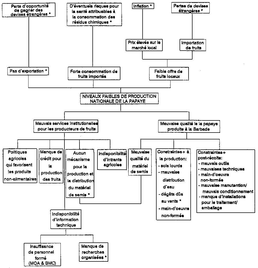 La Figure 5.1 présente des informations provenant du Tableau 5.1 sous la forme d'un arbre de problèmes. Dans ce cas-ci, le problème central prend la forme "Niveau bas de production nationale de la pagaye." Les causes de ce problème central, telles qu'elles sont indiquées à la Figure 5.1, sont attribuables, d'un côté, aux "mauvais services institutionnels offerts aux producteurs de pagaye", et, d'un autre côté, à la "mauvaise qualité de la papaye." Les causes de chacun de ces problèmes respectifs s'identifient aux niveaux inférieurs de l'arbre de problèmes. Les problèmes qui n'avaient pas été identifiés au Tableau 5.1, mais qui ont été identifiées pendant la discussion au cours de la préparation de l'arbre de problèmes, sont marqués d'un astérisque (*).