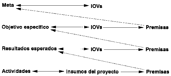 Al agregar la columna para MOVs el Marco Lógico se completa como se muestra más adelante. Las relaciones indicadas por las flechas son la lógica del marco. Es importante señalar que las premisas están fuera del control del proyecto pero influyen en sus resultados.