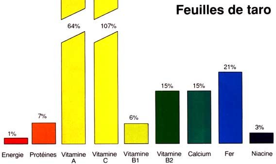 Les feuilles de taro fournissent en grande quantité la vitamine A, nécessaire à une bonne croissance, à la santé des yeux et à la prévention des maladies. Elles contiennent également de la vitamine C et de la vitamine B2 (riboflavine). La vitamine C assure la résistance des tissus, aide l'organisme à assimiler le fer et en facilite les échanges chimiques; la vitamine B2, ou riboflavine favorise elle aussi la croissance et la vue.
