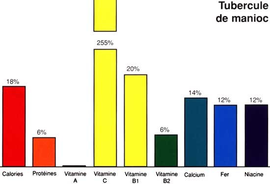 Bien que moins nourrissant que le taro, l'igname, la patate douce, la banane ou le fruit à pain, le tubercule de manioc a une certaine valeur nutritive. Il contient beaucoup de glucides qui apportent des calories à l'organisme, ainsi que des vitamines C, du potassium et des fibres alimentaires. Le corps a besoin de calories pour produire de la chaleur, travailler et jouer. La vitamine C assure la résistance des tissus, aide le corps à assimiler le fer, favorise la cicatrisation des blessures et permet de combattre les infections. Le potassium contribue à assurer un bon équilibre des éléments contenus dans le sang. Les fibres empêchent la constipation en favorisant le transit intestinal. Elles contribuent également à l'abaissement du taux de cholestérol dans le sang et à la prévention des maladies cardio-vasculaires.