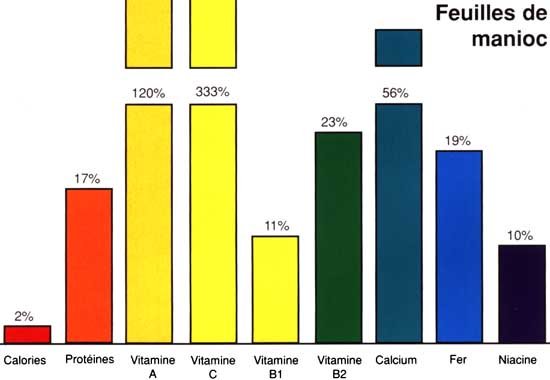 En ajoutant les feuilles aux tubercules, on obtient un repas de manioc très nourrissant. Comme le montre l'histogramme, les feuilles de manioc contiennent beaucoup de vitamine A et de vitamine C. Une demi-tasse de feuilles de manioc cuites couvre la moitié des besoins quotidiens en vitamine A d'un jeune enfant. La vitamine A est importante pour la croissance, pour la vue et pour prévenir les maladies. C'est une substance utile qu'il faut veiller à consommer en quantité suffisante. Les feuilles de manioc contiennent également beaucoup de fibres alimentaires.