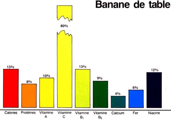 Les bananes sont en outre une bonne source de vitamine C qui consolide les tissus du corps, aide celui-ci à assimiler le fer et favorise le métabolisme. Elles sont également une bonne source de vitamine A: celle-ci est nécessaire à la bonne croissance, à la bonne vue et à la prévention des maladies.