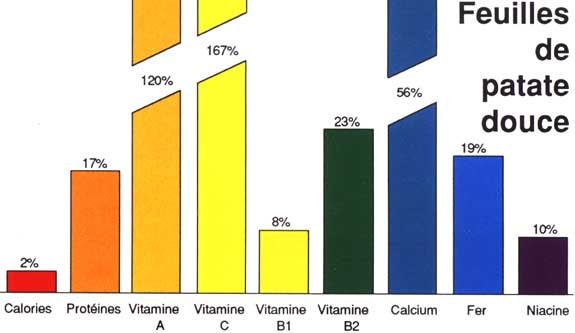 Les feuilles de la patate douce constituent un aliment sain et protecteur. Ce sont des sources excellentes de vitamine A et de vitamine C. La vitamine A est nécessaire pour une bonne croissance, la santé des yeux, et pour se protéger des maladies. La vitamine C assure la résistance des tissus, aide le corps à assimiler le fer et facilite le métabolisme.