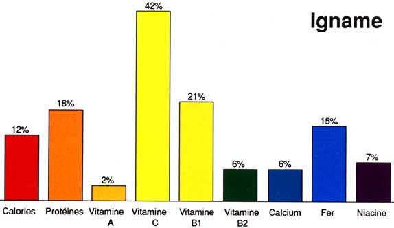 L'igname est une bonne source de calories dont le corps a besoin pour rester actif. L'igname contient également de petites quantités de Vitamine B1 (thiamine) et de Vitamine C. La Vitamine B. (thiamine) aide l'organisme à assimiler les glucides, d'utiliser les aliments énergétiques, et la Vitamine C renforce les tissus, aide le corps à assimiler le fer et facilite le métabolisme. L'igname contient également de la cellulose et quelques fibres qui sont nécessaires au transit intestinal. Absorbée en grande quantité, ce qui est généralement le cas dans le Pacifique, l'igname est également une bonne source de fer et de niacine. Le fer est bon pour le sang et la niacine aide également l'organisme à assimiler les glucides. L'igname ne renfermant pas tous les éléments nutritifs nécessaires à une bonne santé, elle doit être consommée avec d'autres aliments pour que le régime alimentaire soit équilibré. Il faut consommer, outre l'igname, des aliments qui protègent la santé, tels que des légumes à feuilles vertes, et des aliments protéiques tels que le poisson, la viande, les cacahuètes et le lait. L'organisme aura ainsi tous les aliments dont il a besoin pour rester vigoureux et en bonne santé.