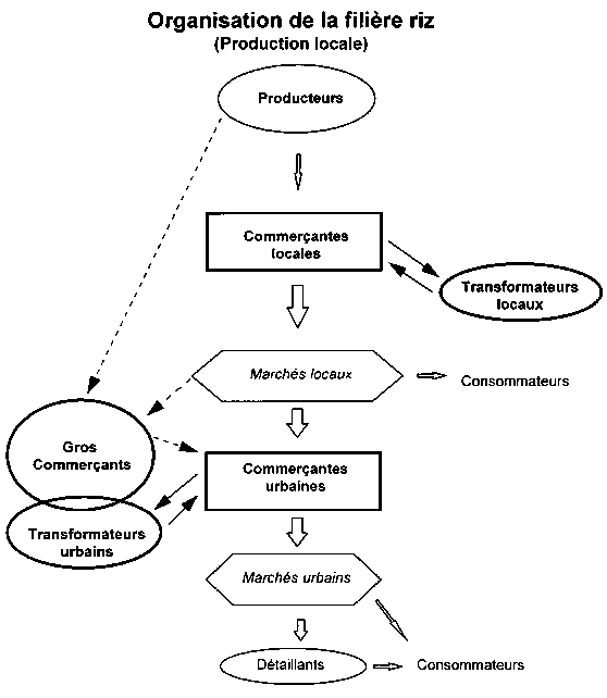 Le commerce des grains produits localement est essentiellement assuré par des commerçants ruraux, généralement des femmes, qui achètent le paddy au niveau des petits marchés villageois, le stockent pour le revendre sur les marchés hebdomadaires des bourgades. Elles peuvent également étuver et décortiquer le paddy pour revendre le riz. Elles sont les principales clientes des unités de transformation artisanales. Ces commerçantes locales disposent souvent d'assez peu de moyens financiers ce qui les oblige à remettre rapidement sur le marché le riz paddy ou le riz transformé. Elles revendent ainsi le riz au détail aux consommateurs locaux ou "en gros" à d'autres commerçantes, les "commerçantes urbaines", sur les marchés hebdomadaires locaux.