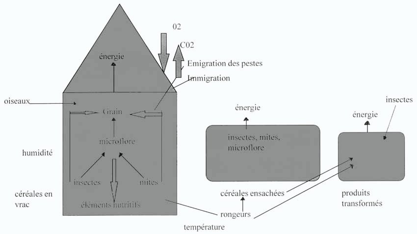 L'étude des pertes d'après récolte comprend de nombreux aspects, qui tiennent à la diversité des produits concernés, des opérations qui se succèdent au long du système post-récolte, des causes qui provoquent ces pertes, des déprédateurs et autres parasites des denrées, sans parler des conditions physiques, techniques, économiques et autres, qui favorisent l'action des agents de détérioration et, en conséquence, l'aggravation des pertes. Cela conduit à une grande variété d'exposés et d'analyses du sujet dans les rapports, les manuels et autres ouvrages, suivant les options et les objectifs des auteurs. M. Bourne (1977), par exemple, s'attache particulièrement aux causes des pertes, en distinguant les causes primaires, les causes secondaires et les lieux et moments des pertes. Ainsi, considérant d'abord les causes biologiques et microbiologiques, il s'intéresse en premier lieu aux insectes, aux rongeurs et aux moisissures. Il en est de même du récent manuel de formation du N.R.I., (rédigé pour la F.A.O., 1994, non publié) qui, sans faire la distinction entre causes primaires et causes secondaires, parle d'abord des ravageurs et des micro-organismes, puis examine les pertes selon le déroulement technique et chronologique des opérations post-récolte.