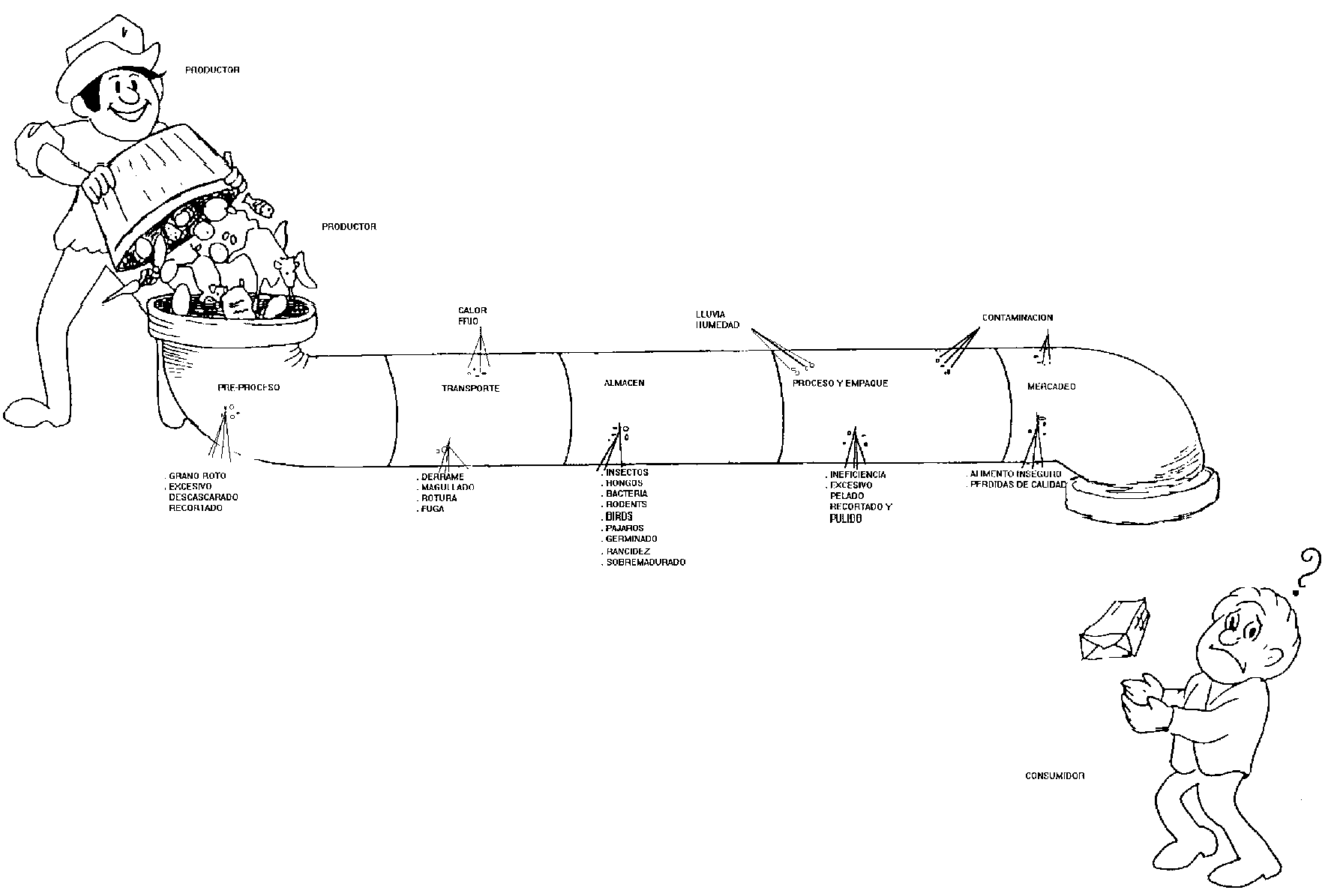 Cuantas veces se ven acciones que concluyen al madurar el producto y sobre las cuales se injertan, como por anexo, un aspecto de comercialización o de transformación, sin preocuparse de la continuidad y de la coherencia en las operaciones. ¿Que sucede entre el campo y el negocio del comerciante o el taller de transformación? ¿En qué momentos se hacen los traspasos de propiedad entre los diferentes operadores? ¿Cómo se reparte el valor agregado? Misterio!....