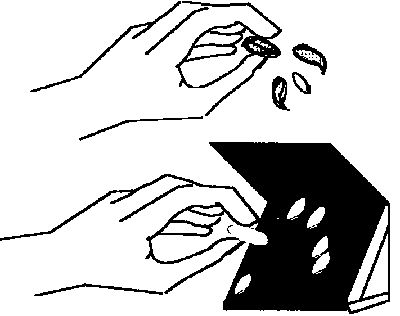 - poser 50 grains BLANCS et ENTIERS ainsi obtenus, dans les PERFORATIONS de la plaque supérieure, ou sur une plaque en bois (épaisseur moyenne: 0,3 mm), percée de 50 perforations de dimension fonction de la variété (ronde ou longue), et collée sur une plaque de verre de grains". (fabrication artisanale). Un morçeau de miroir placé en dessous de cette plaque peut servir d'élément réfléchissant la lumière (soleil).