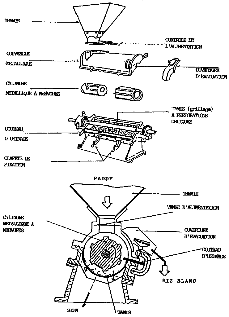 L'usinage du paddy suit deux étapes, LE DECORTICAGE proprement dit (élimination de la balle de riz) et LE BLANCHIMENT (élimination des couches de son). Ces deux étapes se font parfois dans une même "chambre" comme dans les décortiqueuses villageoises (Engelberg).